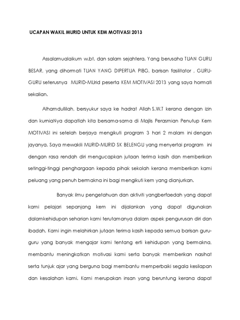 Ucapan Wakil Murid Untuk Kem Motivasi 2013