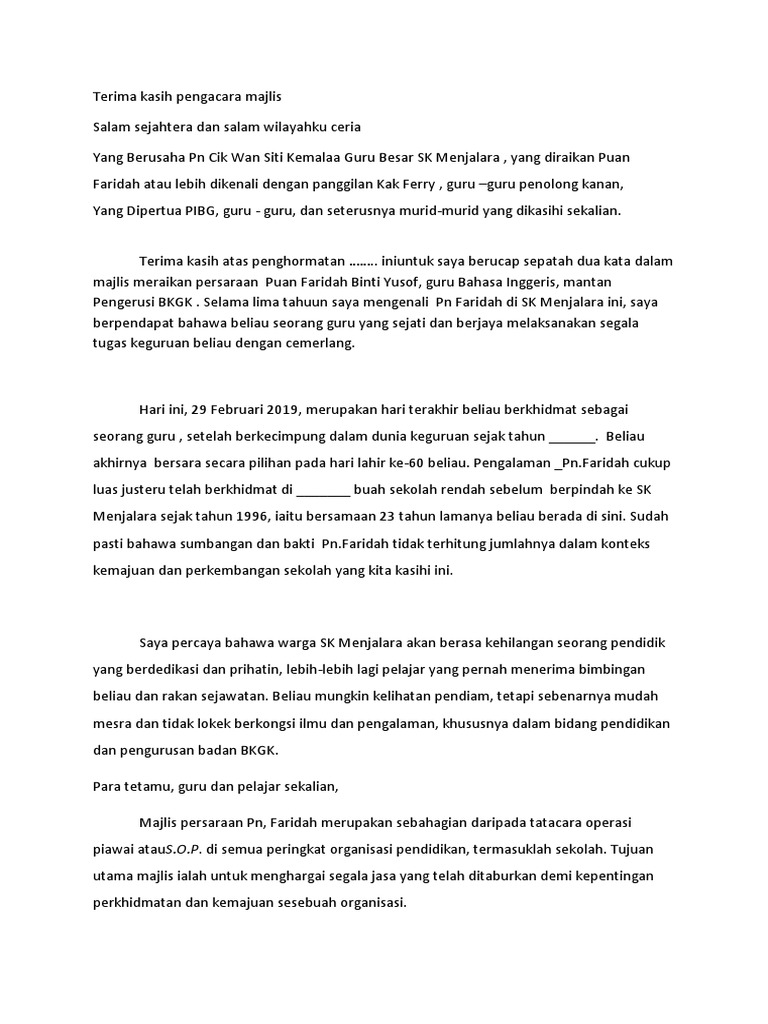 Teks Ucapan Perpisahan Pn Faridah